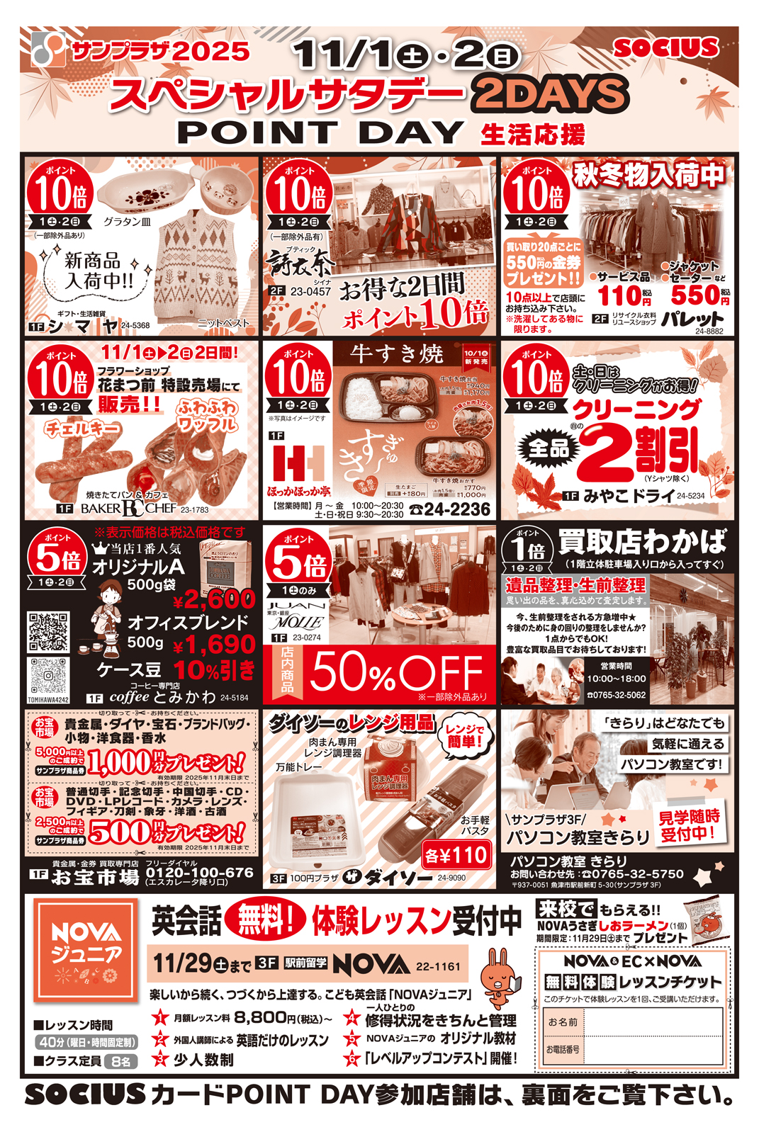11/1(土)▶11/2(日)☆スペシャルサタデー2DAYS☆開催します!週末はサンプラザへ行こう!
