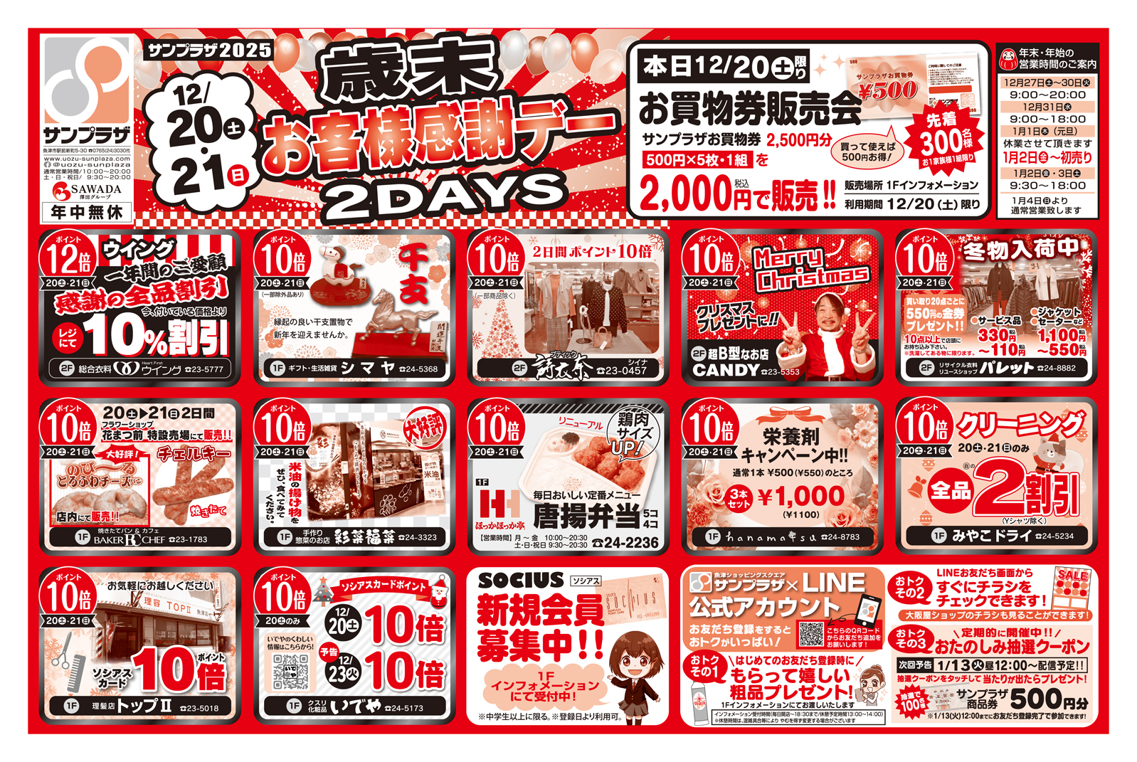 12/20(土)▶12/21(日)☆歳末お客感謝デー2DAYS☆開催します!週末はサンプラザへ行こう!12/20(土)は今年最後のお買物券販売会開催します!
