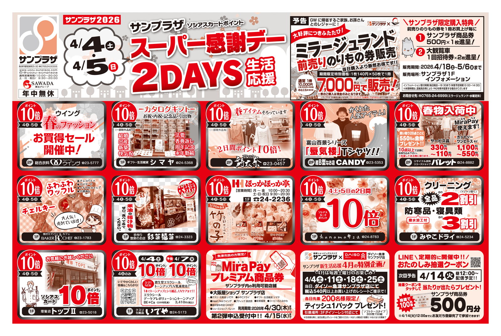 4/4(土)▶4/5(日)☆スーパー感謝デー2DAYS☆開催します!週末はサンプラザへ行こう!