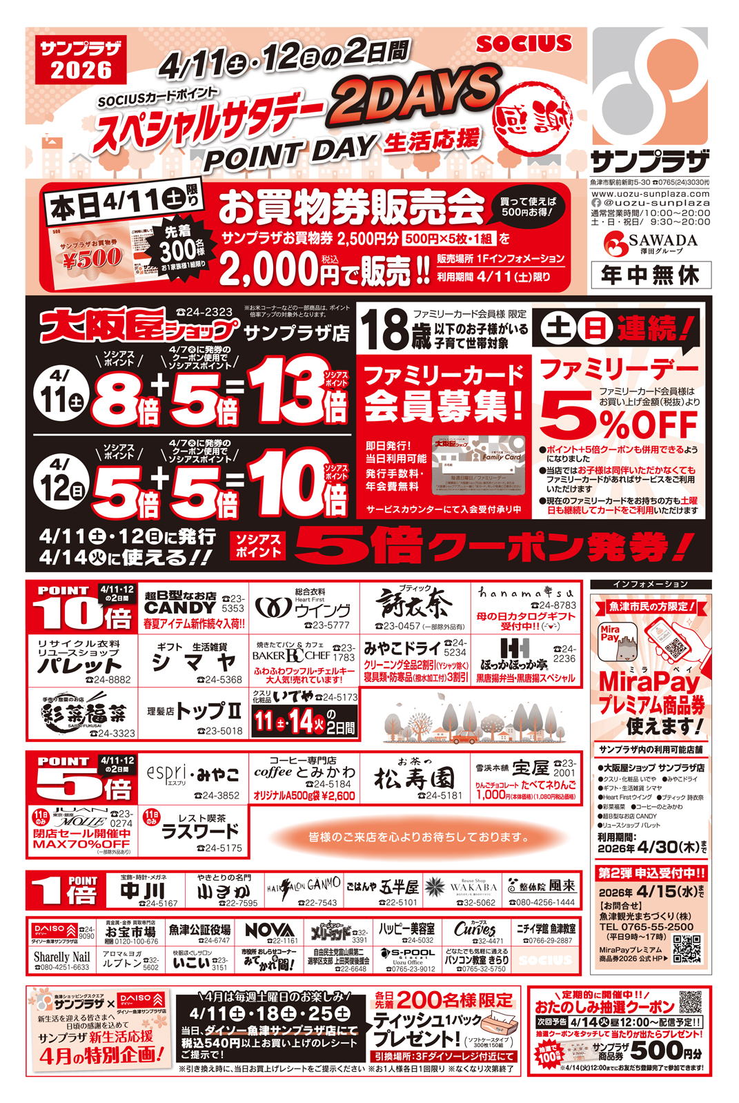 3/24(火)☆春の大サンプラザ祭 第2弾☆開催します!明日はサンプラザ祭の最終日!超お得な1日をお届けします。お買物券販売会も行います!
