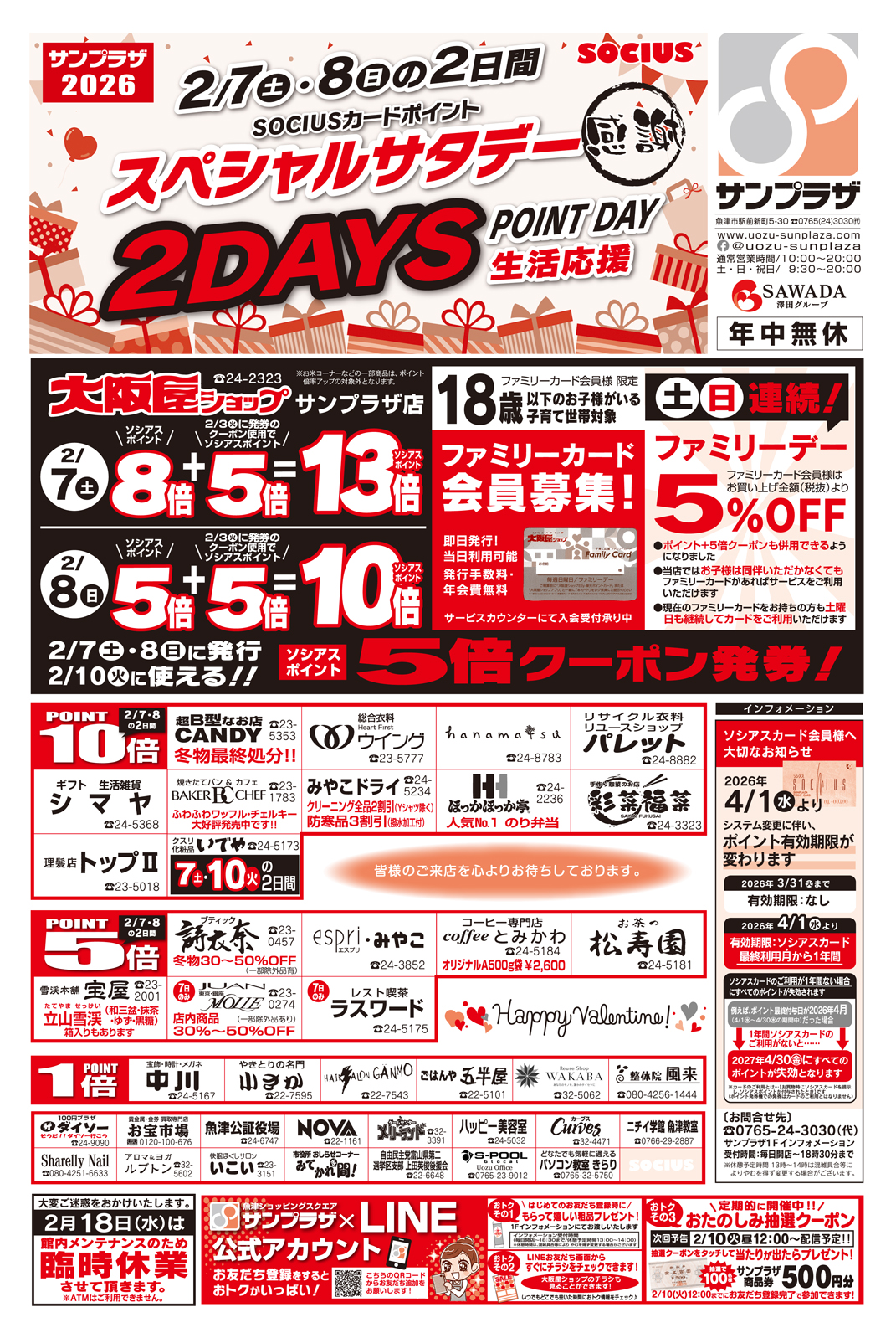 2/7(土)▲2/8(日)☆スペシャルサタデー2DAYS☆開催します!週末はサンプラザへ行こう!